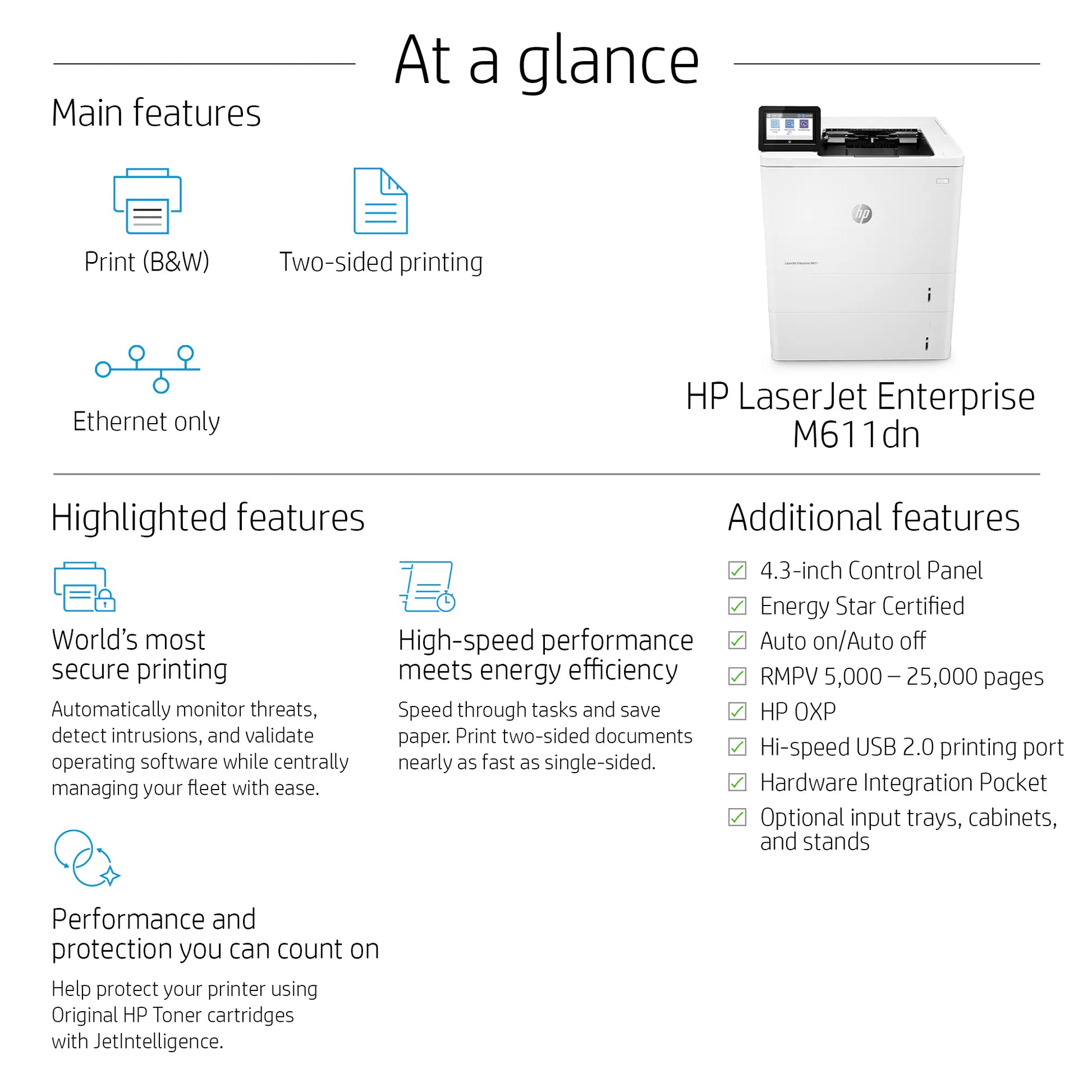 - Auto duplex printing; 2 paper trays (standard); HP Sure Start
